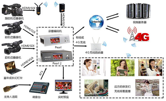 活動期間,我公司做為設(shè)備租賃商提供了高科技的視頻編碼,轉(zhuǎn)碼及上載視頻服務(wù)器后微信直播等設(shè)備服務(wù),全套設(shè)備集成了具導(dǎo)播功能的多機位視頻無縫切換,字幕圖文疊加,上傳同時存儲視頻,攝像機無線對發(fā)信號,4G網(wǎng)絡(luò)環(huán)境的組建。整個活動采用了三臺攝像機進(jìn)行錄制,一臺放置在會場的前方,用于錄制會場觀眾縱向的場景;一臺放置在會場后方的搖臂上,用于錄制由后方步入教堂時的場景;還有一臺攝像機采用的是流行的5D Mark3用于實時跟蹤拍攝,該機位的信號輸出接入了我們的無線視頻發(fā)射器,以此保證了跟蹤拍攝期間無線纜滿場亂飛的現(xiàn)像。