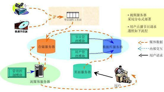 網絡視頻點播系統(tǒng)包括5個主要部份:節(jié)目采編錄入系統(tǒng)、專業(yè)視頻服務器、視頻庫、WEB服務器、客戶端播放設備。