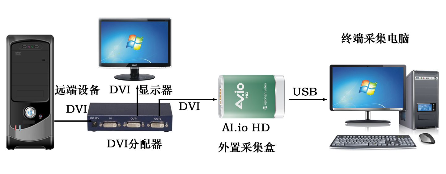只需要將DVI 或HDMI和VGA轉(zhuǎn)接頭用線纜連接到設(shè)備接口上,再用USB線纜將 AV.io HD采集設(shè)備連接到您的電腦設(shè)備即可開始共享視頻。