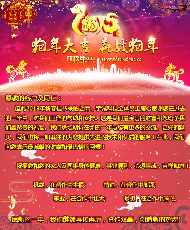 我公司放假安排如下:2018年2月13日(農歷臘月二十八)至2月25日(農歷正月初十)放假。為保證過節和業務兩不誤,宇誠科技真誠提醒您注意以下事項:放假期間我公司將不安排出貨和業務事宜,若貴公司有訂貨需要,請配合在放假前后處理。我們將以更優質的服務為您提供更全面的合作.再次感謝您對本公司一直以來的關注與支持!