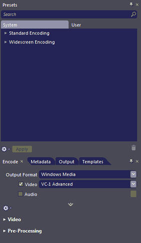 在Presets預(yù)設(shè)中選擇Encoder編碼選項卡,選擇指定輸出格式和視頻編碼器。