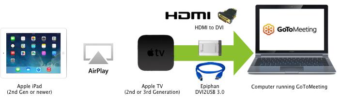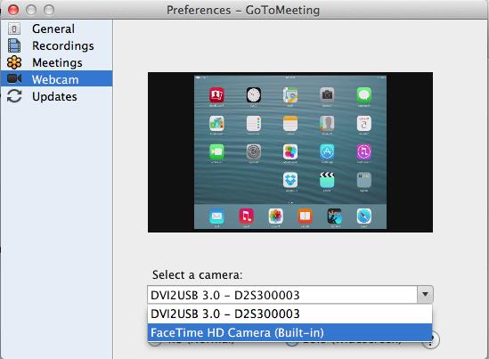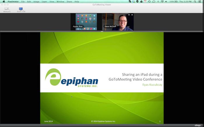 GoToMeeting的高級(jí)版使用戶能夠在同一時(shí)間分享他們的攝像頭和桌面屏幕。使用一個(gè)Epiphan幀或視頻捕獲器,您可以共享一個(gè)iPad屏幕像一個(gè)攝像頭或是“桌面”。