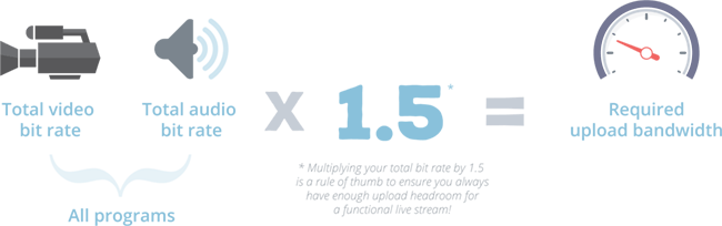 將您的總比特率乘以1.5是一個經(jīng)驗法則,我們建議始終擁有大約1.5倍的流的比特率,以解決這些可能的網(wǎng)絡波動。例如,如果您直播流的比特率為5 Mb / s,則確保您擁有至少7.5 Mb / s的上傳帶寬,以確保可靠的直播。