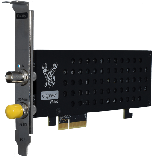 Osprey Raptor(猛禽) 915 具有一個額定為3Gb/s的SDI輸入。端口適用 SD, HD 和 3G. 所有 9xx Raptor 卡可以采集高達60fps. SDI 內嵌16 音頻通道(8 個立體聲). 帶1路環出.