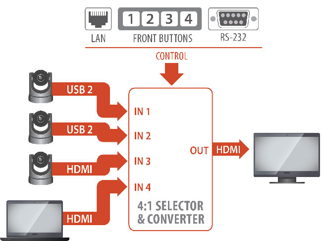 使用Inogeni CAM系列的多路攝像機(jī)選擇器,您的會議可以像您想要的一樣。 CAM產(chǎn)品可讓您從按鈕或遠(yuǎn)程中選擇四個(gè)來源之一。使用SHARE2,您可以呈現(xiàn)和敘述PowerPoint程序,切換一個(gè)揚(yáng)聲器和一個(gè)組的圖像之間,將一個(gè)攝像頭集中在面試官和受訪者上,呈現(xiàn)并解釋電子表格或數(shù)字化的X光片等。通過實(shí)踐,您可以使一個(gè)相機(jī)全屏,并更改其他相機(jī)或光源正在關(guān)閉的屏幕上。