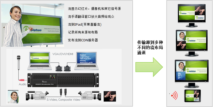 Epiphan的VGADVI Broadcaster Pro?可以從多個(gè)視頻源輸入并輸出多個(gè)視頻流。例如,從主持人鏡頭的視音頻內(nèi)容,主持人的筆記本電腦演示,手語翻譯的實(shí)時(shí)觀看,封閉字幕的實(shí)時(shí)顯示以及會(huì)議的音頻內(nèi)容。在一個(gè)活動(dòng)中可以使用VGADVI Broadcaster Pro創(chuàng)建各種實(shí)時(shí)視頻的輸出通道與各種內(nèi)容源的布局。