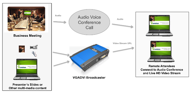 VGADVI Broadcaster能簡單的捕捉會議的音視頻來源(主持人,音頻,和主持人的筆記本電腦顯示)。然后VGADVI Broadcaster合并這些音視頻到一個畫中畫的視頻流。遠程與會者撥入到音頻會議并連接URL查看現場直播的視頻會議。
