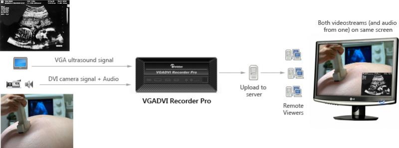 這種記錄和廣播解決方案很容易連接到超聲波機(jī)來捕獲所需的圖像。并且可以同時從兩個來源捕獲并記錄視頻。此功能對于我們是非常重要的。我們不僅要獲得機(jī)器的超聲圖像,我們也希望展示超聲檢查操作者如何將醫(yī)療果凍膠放在皮膚上,以及探頭如何在他/她的皮膚上移動,一邊獲取所需的圖像,還有病人如何改變身體位置等,利用連接著攝像機(jī)的VGADVI Recorder Pro這可以很容易地實(shí)現(xiàn)。該設(shè)備將視頻從兩個數(shù)據(jù)源結(jié)合到一個文件中,并增加了一個音軌用于評論和解釋。
