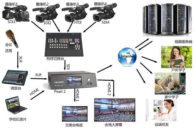 大會期間采用了4臺攝像機進行全程多角度拍攝,后將信號傳輸給特技切換臺,再由切換臺輸出視頻給Pearl 2。音頻通過會場調音臺輸出接入Pearl 2的平衡音頻輸入,通過自由搭配音頻源,保證了音頻的無雜音效果。后將播放學校紀錄片視頻的筆記本電腦HDMI輸出給Pearl 2的HDMI輸入,并通過本身的導播切換功能實現攝像機與紀錄片視頻的無縫切換。再將Pearl 2的兩個HDMI輸出一路給主席臺的電視供主持人監看,一路給會場的大屏供全場人員觀看,最后將視頻流推到校園的視頻服務器上,供未能到場的校友,教師及學子觀看。